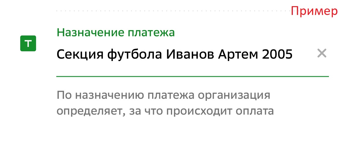 Далее в поле "Назначении платежа" укажите: Секция футбола фамилия, имя, год рождения ребенка.